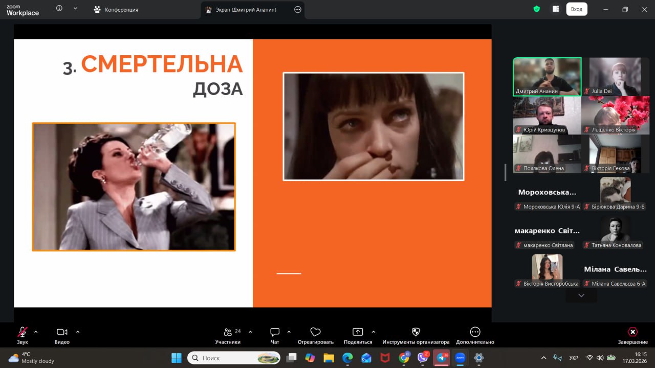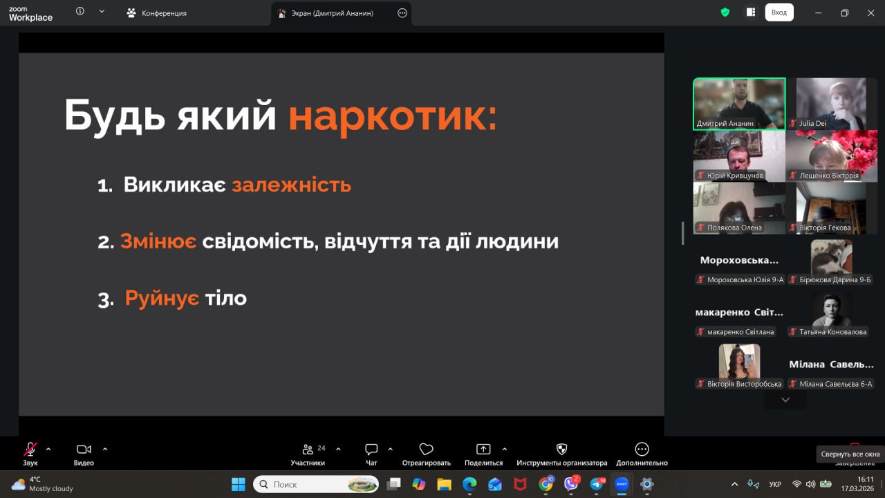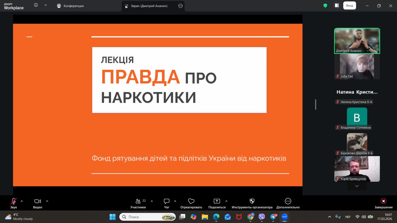Спеціально запрошеним гостем став лектор Дмитро Сергійович Ананін, представник ХМГО «Фонд порятунку дітей та підлітків України від наркотиків». Під час зустрічі учні отримали важливу та змістовну інформацію про вплив наркотичних речовин на фізичне та психічне здоров’я людини.