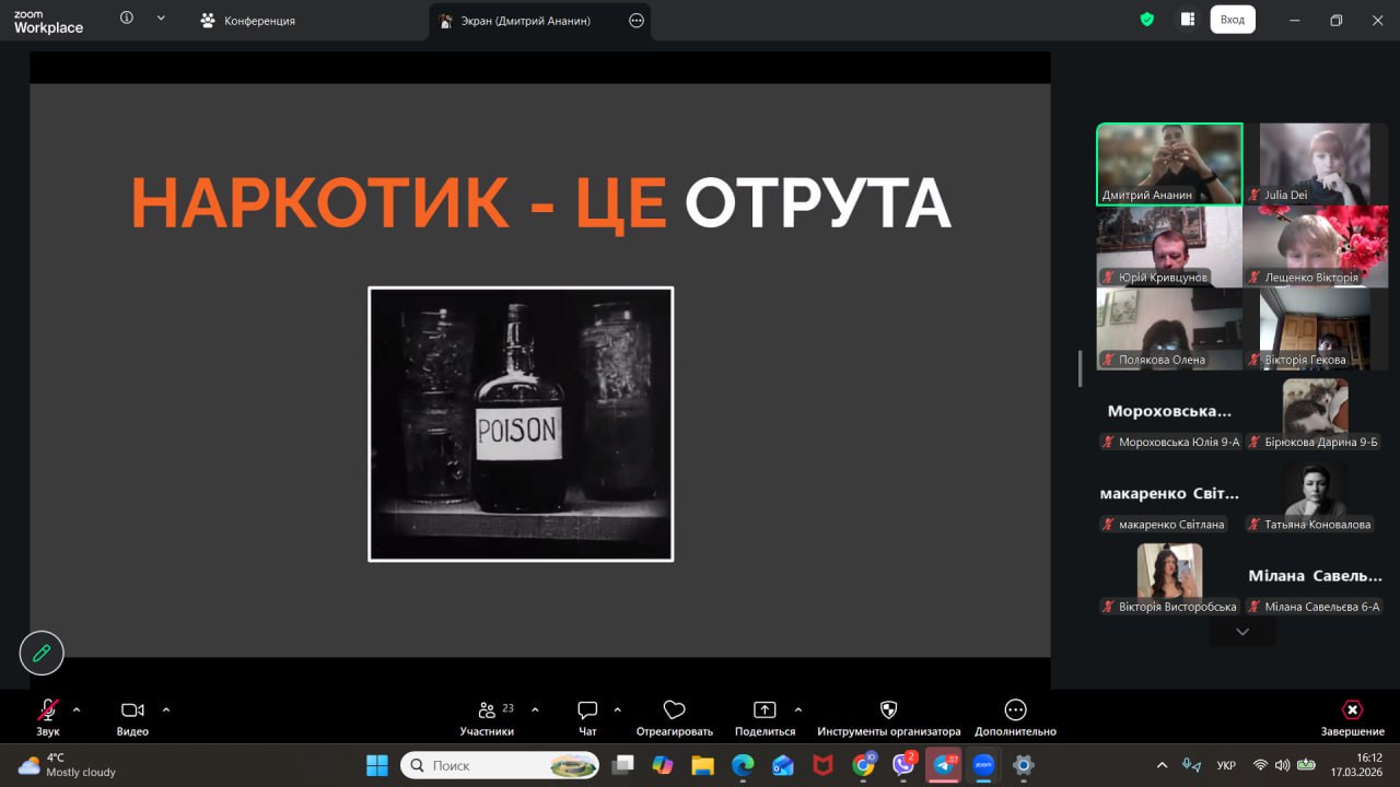 У КЗ «Харківська спеціальна школа №12» ХОР сьогодні, 17.03.2026 року, відбувся просвітницький захід на тему «Правда про наркотики», спрямований на формування свідомого ставлення учнів до власного здоров’я та попередження шкідливих звичок.